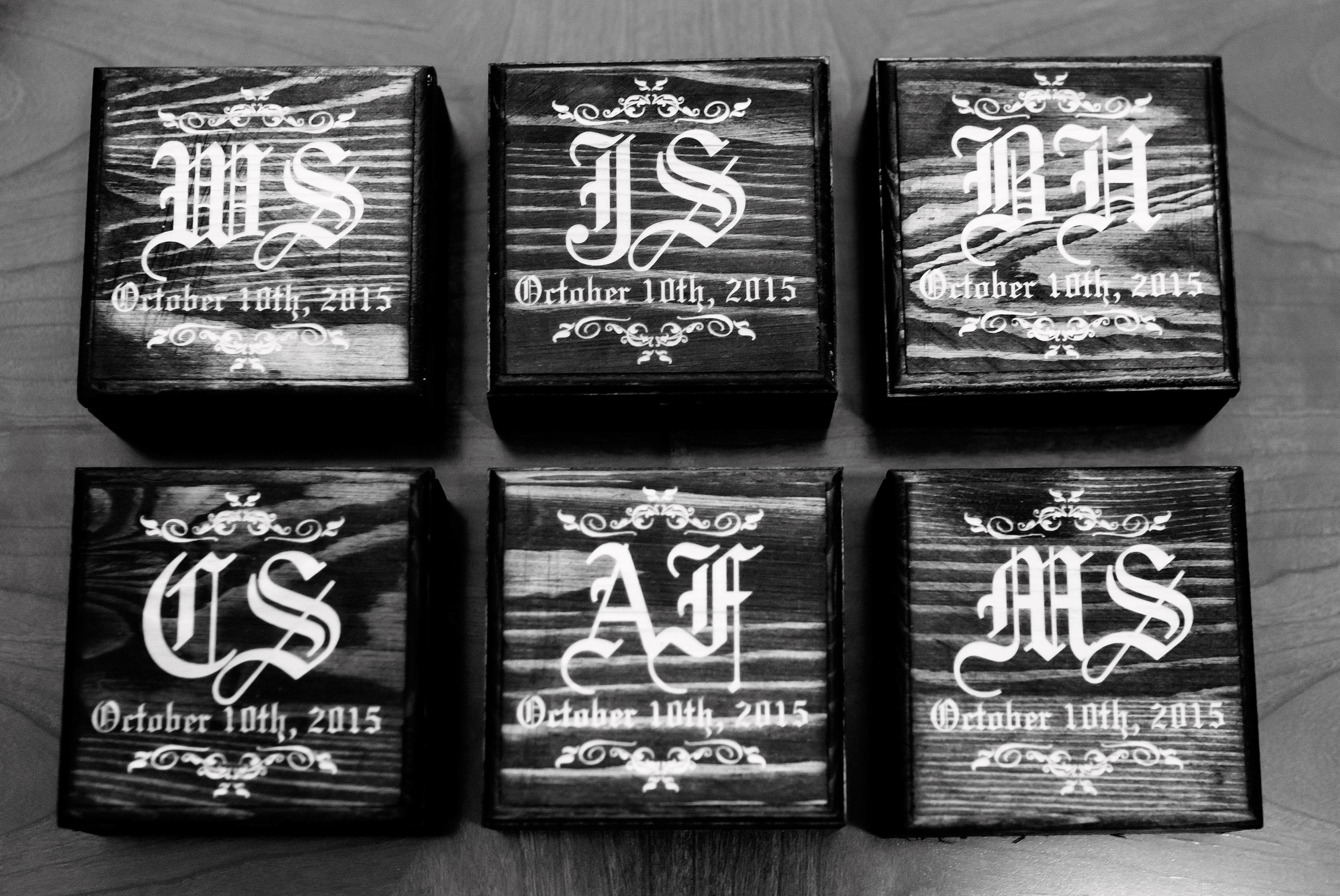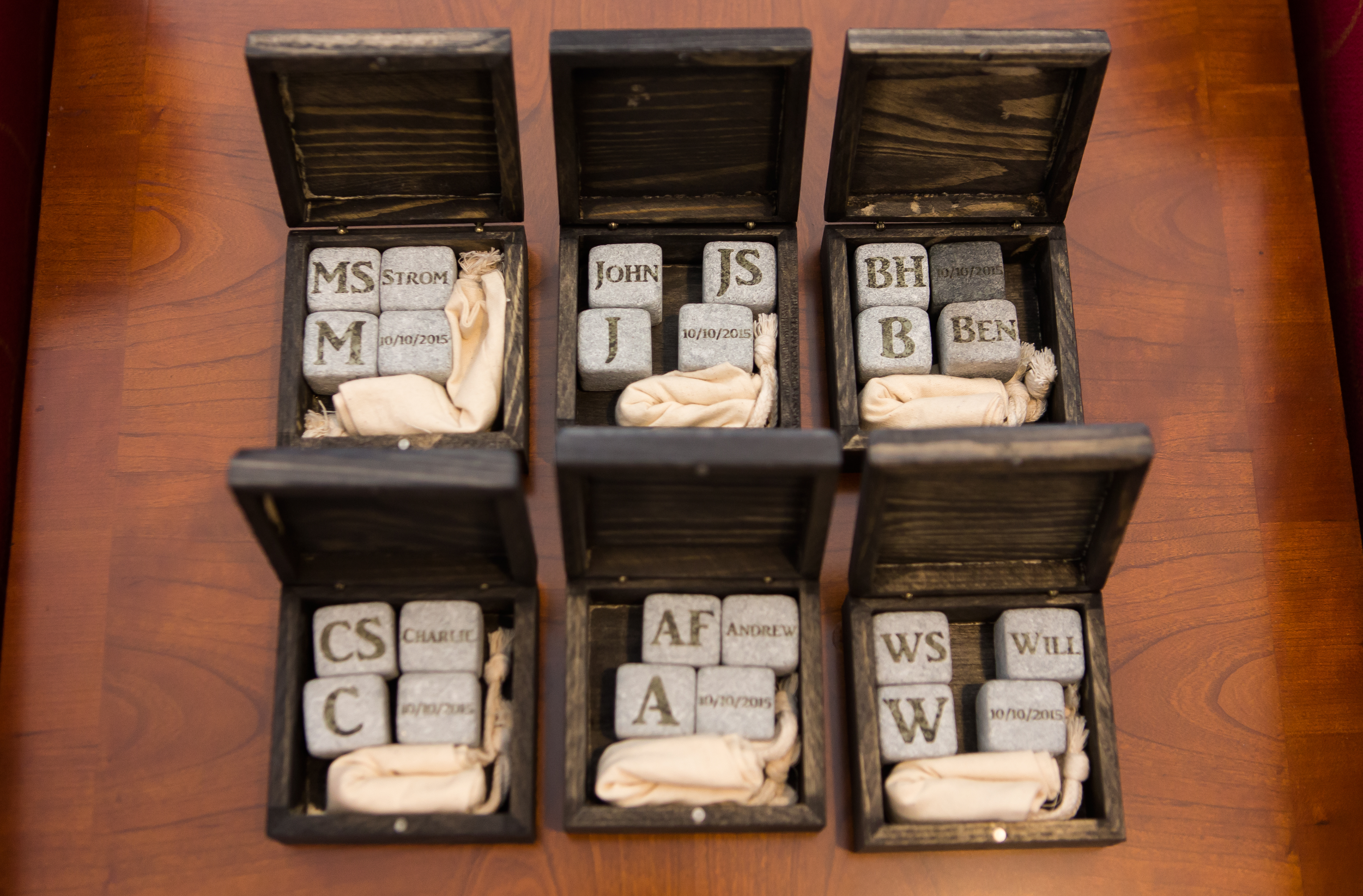 At Emily and John’s wedding, we loved the idea of a custom initial engraved box. Complete with the wedding date and set of whiskey rocks to commemorate the couple’s union. Can we get a set?!